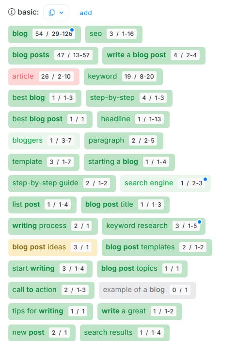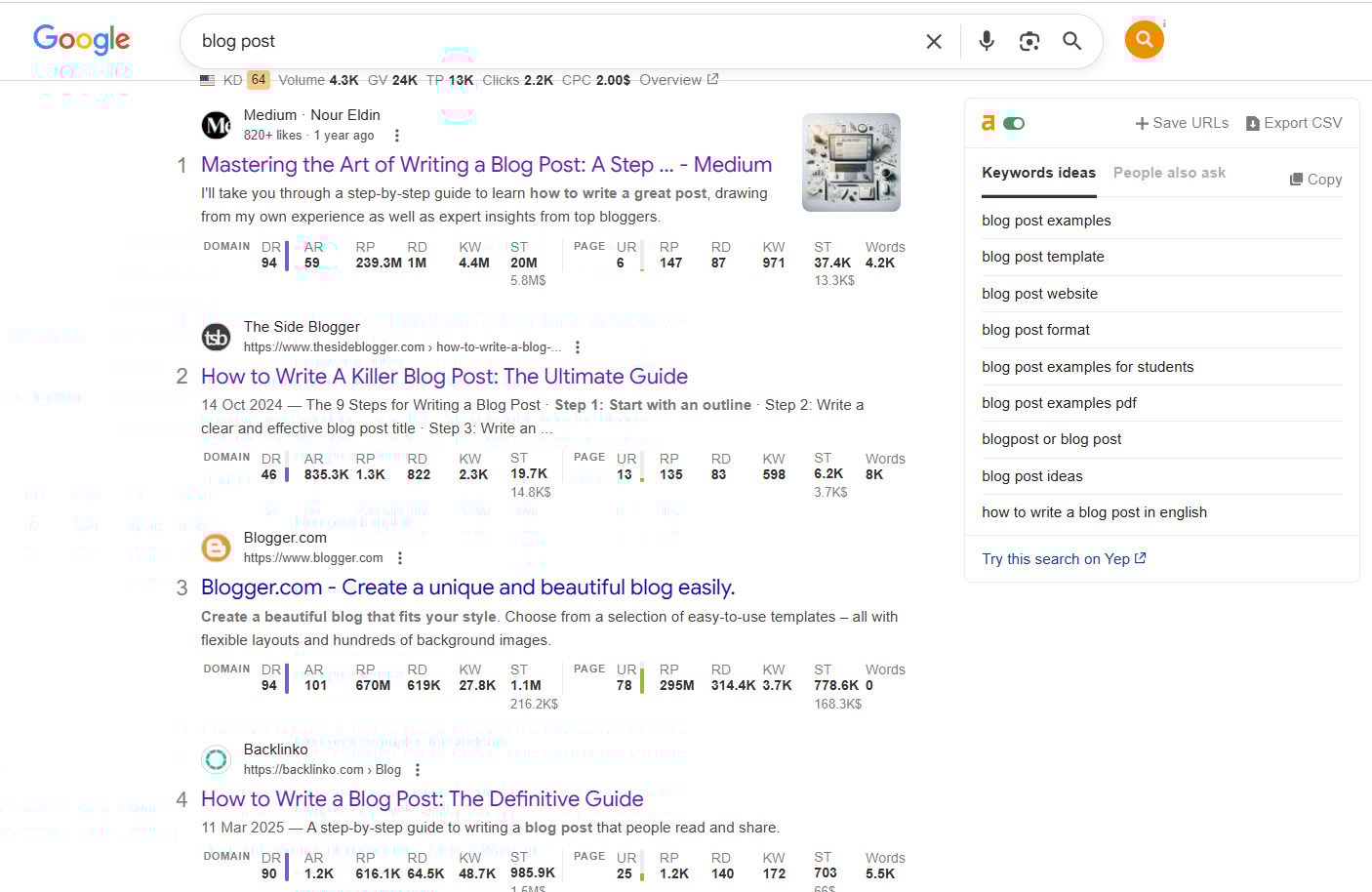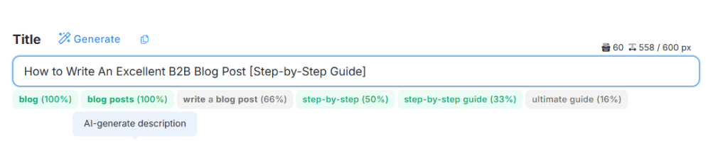 For example, when you look for ‘blog post,’ you can see related keywords like “blog post about ai”, “blog post examples”, “blog post template,” and “blog post ideas” as possible keywords to include.