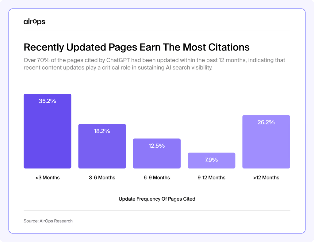 Airops has found that 35% of pages quoted by ChatGPT were updated within the last 3 months and 70% within the last year.