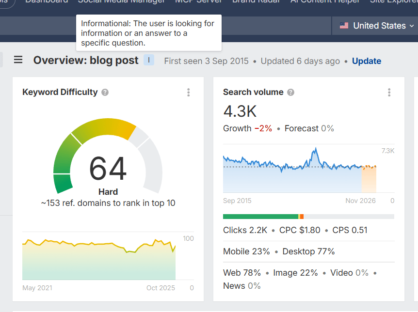 The keyword analysis also tells me the search intent. Or, in other words, what the reader is looking for when they search for the keyword.