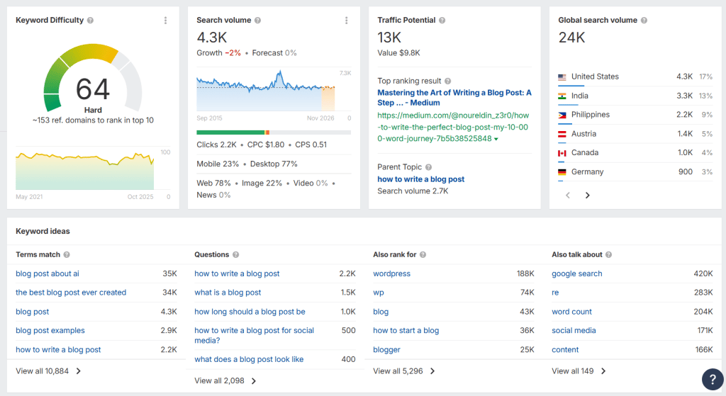 This aligns with the keyword research results, as the most frequently asked question is “how to write a blog post.”