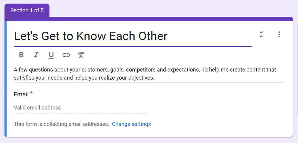 When writing for clients, all this information is likely to come from the content manager or strategist. When I start working with a new client, I ask them to provide relevant details through my onboarding form.